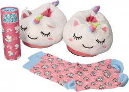 Design z jednorożcem i dołączonymi skarpetkami w stylu prezentowym ucieszy jako miły podarunek i praktyczny dodatek do domu.