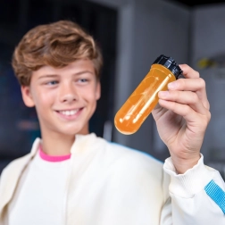 Napełnij tubę wodą, zamknij i potrząsaj, aż zacznie bulgotać, aby odkryć swój tajemniczy łup.
