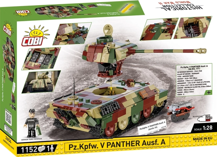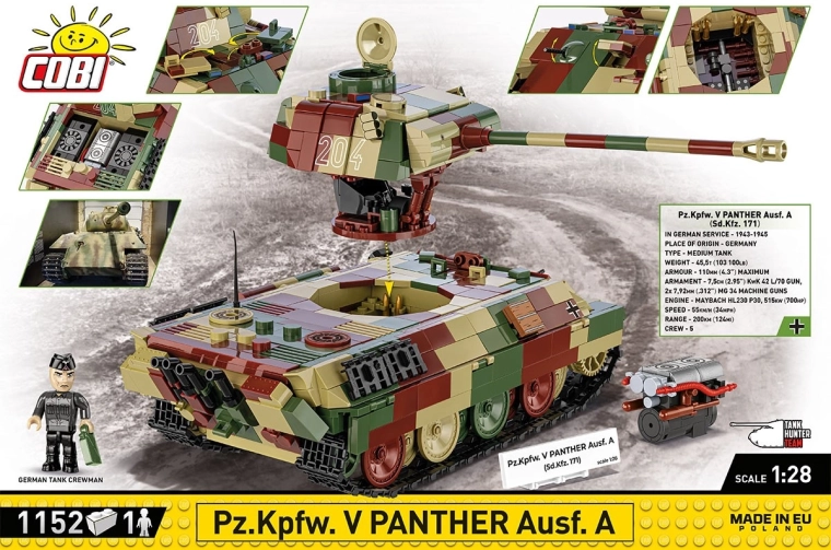 Zbuduj autentyczny model legendarnego czołgu Panther Ausf. A w skali 1:28 od COBI. Zestaw z 1152 elementami oferuje obrotową wieżę, regulowaną lufę, funkcyjne gąsienice oraz bogate detale wnętrza, w tym wyjmowany silnik. W komplecie znajduje się figurka czołgisty i kolekcjonerska tabliczka z nazwą. Powstało we współpracy z Muzeum Broni Pancernej w Kłaninie dla maksymalnej autentyczności.