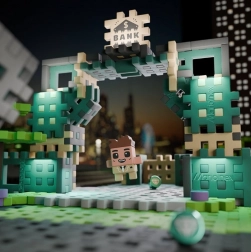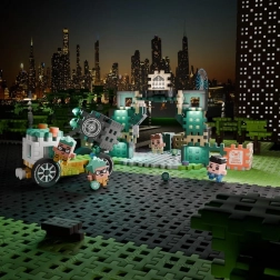 Wejdź do tętniącego życiem Mini Waffle City, gdzie nie brakuje emocji. Zbuduj solidną bankę ze wzmocnionymi ścianami, wypełnij sejf lśniącymi diamentami i zdecyduj, jak potoczy się historia – czy złodziejom Peterowi i Lu uda się uciec, czy policjant Gary wszystko udaremni? Figurka bankiera Richarda zna każdy kąt budynku, dzięki czemu zabawa jest jeszcze ciekawsza.