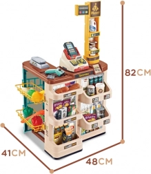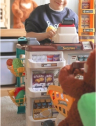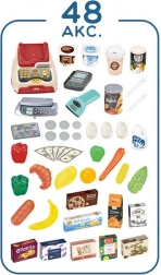 W zestawie znajduje się także wózek/koszyk na zakupy do zabawy we dwoje, papierowe pieniądze, karta płatnicza oraz różne produkty spożywcze (owoce, warzywa, napoje, produkty mleczne itp.). Estetyczny design pasuje do każdego wnętrza, a kolorowe opakowanie prezentowe ucieszy przy każdej okazji.
