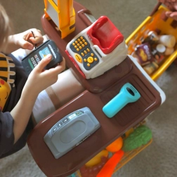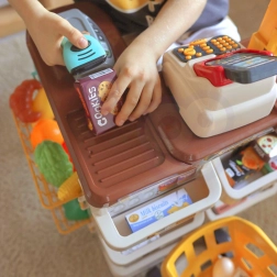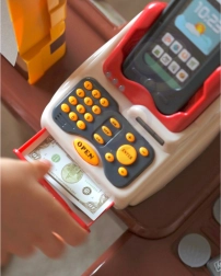 Kasa z wysuwaną szufladą na pieniądze, czytnikiem kart i skanerem, który świeci i wydaje dźwięk, zapewnia dzieciom autentyczne doświadczenie zakupów.