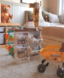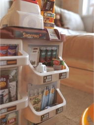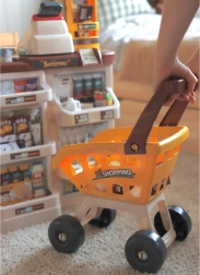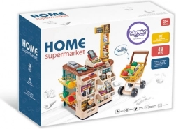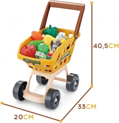 W zestawie znajduje się koszyk/wózek oraz wiele produktów spożywczych, jak owoce, warzywa, mleko czy sok – wszystko do pełnowartościowej zabawy w sklep.