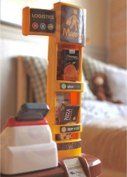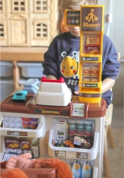 Mechaniczna waga wiernie odwzorowuje tę prawdziwą, a półkowy układ z cenówkami pomaga dzieciom sortować, układać i uczyć się wartości.