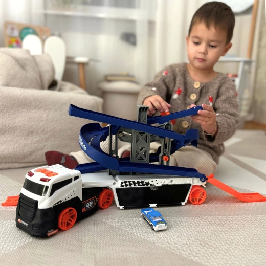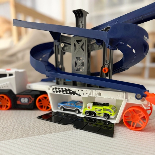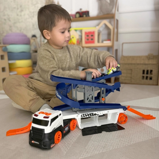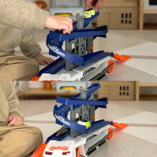 Wielopoziomowy tor z rampą umożliwia parkowanie, szybkie zjazdy i skoki. Doskonały do rozwijania motoryki i ducha rywalizacji.