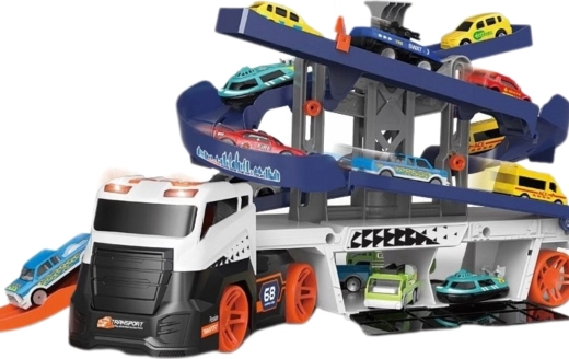 Otwierane boczne klapy i pojemna naczepa zapewniają łatwy załadunek i realistyczny przewóz małych samochodzików.