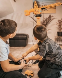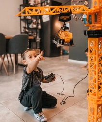 Duży żuraw WOOPIE przenosi realistyczną budowę do pokoju dziecięcego. Dzięki zdalnemu sterowaniu obsługa jest prosta i wciągająca – żuraw obraca się, podnosi, opuszcza i przesuwa ładunki po ramieniu. Regulowana wysokość 103 lub 64 cm pozwala dopasować zabawę do przestrzeni i wieku dziecka.
