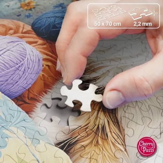 Ciesz się relaksującym układaniem z pięknym motywem kota bawiącego się kłębkami przędzy. To wysokiej jakości puzzle z 1000 elementami oferuje precyzyjne wycięcia, przyjemny papier, a po ułożeniu tworzy obraz o wymiarach ok. 50 × 70 cm – idealny do oprawienia w ramę.