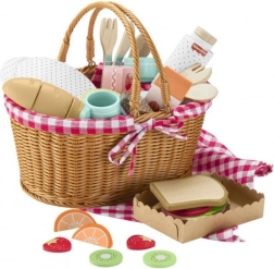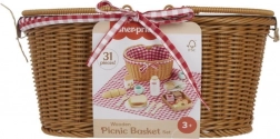 - Koszyk, koc w kratę, taca, pojemnik na napoje, 2 kubeczki, 2 talerze, 6 sztućców, 17 sztuk drewnianego jedzenia (owoce, ser, pieczywo itp.)