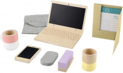 Stylowy i bezpieczny drewniany zestaw home office dla małych szefów od 3 lat. Zawiera 9 elementów, w tym „laptop” i „telefon” z ekranem do rysowania kredą, mysz, kubek, zszywacz, stojak na ołówki, teczkę, dokumenty oraz torbę na laptopa. Wykonany z drewna z certyfikatem FSC dla trwałej i zrównoważonej zabawy, która rozwija kreatywność, małą motorykę oraz umiejętność zabawy w odgrywanie ról.