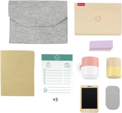- Torba na laptopa, drewniany „laptop” z ekranem do rysowania kredą, drewniany „telefon” z ekranem do rysowania kredą, kubek, mysz, zszywacz, stojak na ołówki, teczka, zestaw „dokumentów”