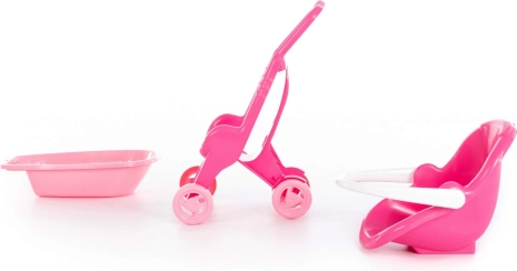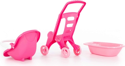 Wózek jest podzielony na dwie części: jeździk i przenośne siedzisko. Dodatkowo w zestawie znajdziesz wanienkę do „kąpieli” lalki.