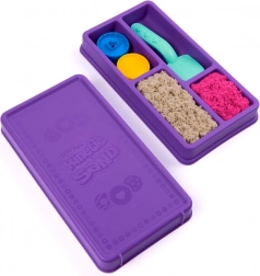 Piasek powstaje z naturalnego materiału, trzyma się razem, a jednocześnie łatwo się sprząta. Nie wysycha, więc do tworzenia możesz wracać wciąż na nowo. Zamykane fioletowe etui utrzyma piasek i narzędzia w porządku – idealne w podróży i w dziecięcym pokoju.