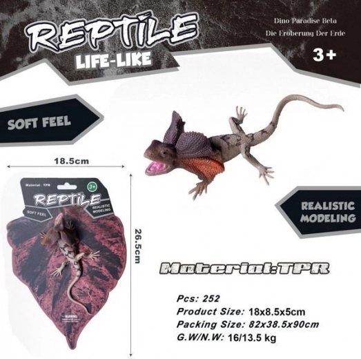 Realistyczna gumowa jaszczurka inspirowana agamą kołnierzastą ucieszy dzieci i kolekcjonerów. Oferuje miękki i elastyczny materiał, wierne detale oraz praktyczny rozmiar 18 cm do zabawy i dekoracji.
