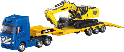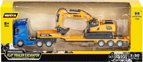 Metalowy ciągnik siodłowy z naczepą niskopodwoziową i koparką HUINA 1:50 żółty