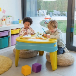 Nakładana pokrywa w mgnieniu oka tworzy równą powierzchnię do rysowania i chroni zawartość stołu przed zabrudzeniami. Wbudowane wgłębienia utrzymują ołówki i drobiazgi na miejscu.