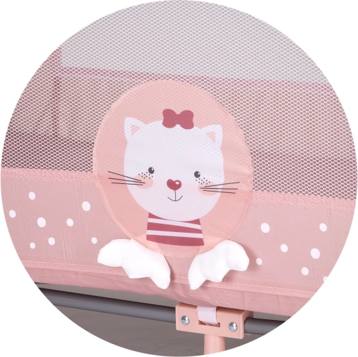 Łóżeczko turystyczne CHIPOLINO Capri różowe z motywem kotka. Szybkie składanie, boczny zamek, miękka mata i torba transportowa. Bezpieczne zgodnie z EN 716-1.