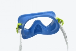 Niebieska maska do nurkowania jest wyposażona w soczewki z filtrem UV oraz regulowany silikonowy pasek, który zapewnia wygodę i bezpieczeństwo pod wodą.