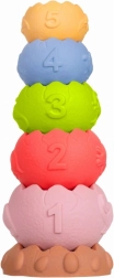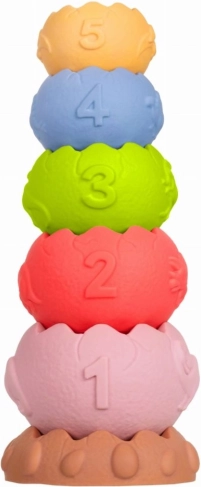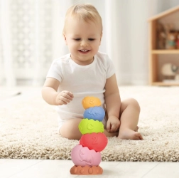 Pastelowe elementy są łatwe do chwytania i stabilnie układają się w wysoką wieżę. Dzieci ćwiczą koordynację ręka–oko oraz cierpliwość przy każdym zbudowaniu piramidy.