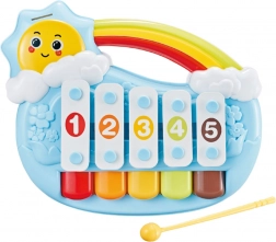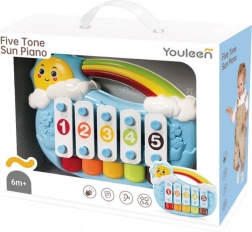 Urocze pianinko w kształcie uśmiechniętego słoneczka oferuje 5 tonów, które dzieci łatwo wydobywają lekkim stuknięciem. Od 6. miesiąca życia wspiera rozwój zmysłów, małej motoryki i wrażenia rytmu. W zestawie znajdują się 3 karty z melodiami, kolorowe wykonanie przyciąga uwagę, a bezpieczne wykończenie z zaokrąglonymi krawędziami jest idealne dla najmłodszych. Praktyczny uchwyt do trzymania ułatwia przenoszenie w domu i w podróży.
