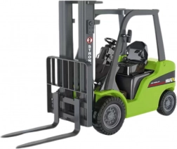 Ten model wózka jest wyposażony w ruchome widły, które umożliwiają podnoszenie i opuszczanie, co symuluje rzeczywistą pracę pojazdu. Obrotowe koła zapewniają płynny ruch i zwiększają autentyczność modelu.