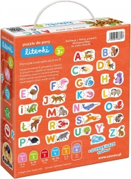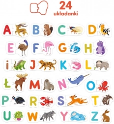 Odkryj zabawny zestaw edukacyjny z 24 dużymi, dwuelementowymi puzzlami, które łączą urocze zwierzątka z literami alfabetu. Uczy i bawi, rozwija małą motorykę, uwagę oraz pierwsze kroki w czytaniu i pisaniu. W zestawie znajduje się także poradnik z pomysłami na zabawy.
