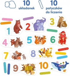 Ten kolorowy zestaw edukacyjny jest idealny dla dzieci w wieku przedszkolnym, które poznają liczby. Każde dwuelementowe puzzle zawiera ilustracje zwierzątek i odpowiadającą im cyfrę – zadaniem jest prawidłowe ich połączenie. Dzięki patyczkom do liczenia możesz wzbogacić naukę o dodatkowe, angażujące aktywności i wzmocnić rozumienie ilości.