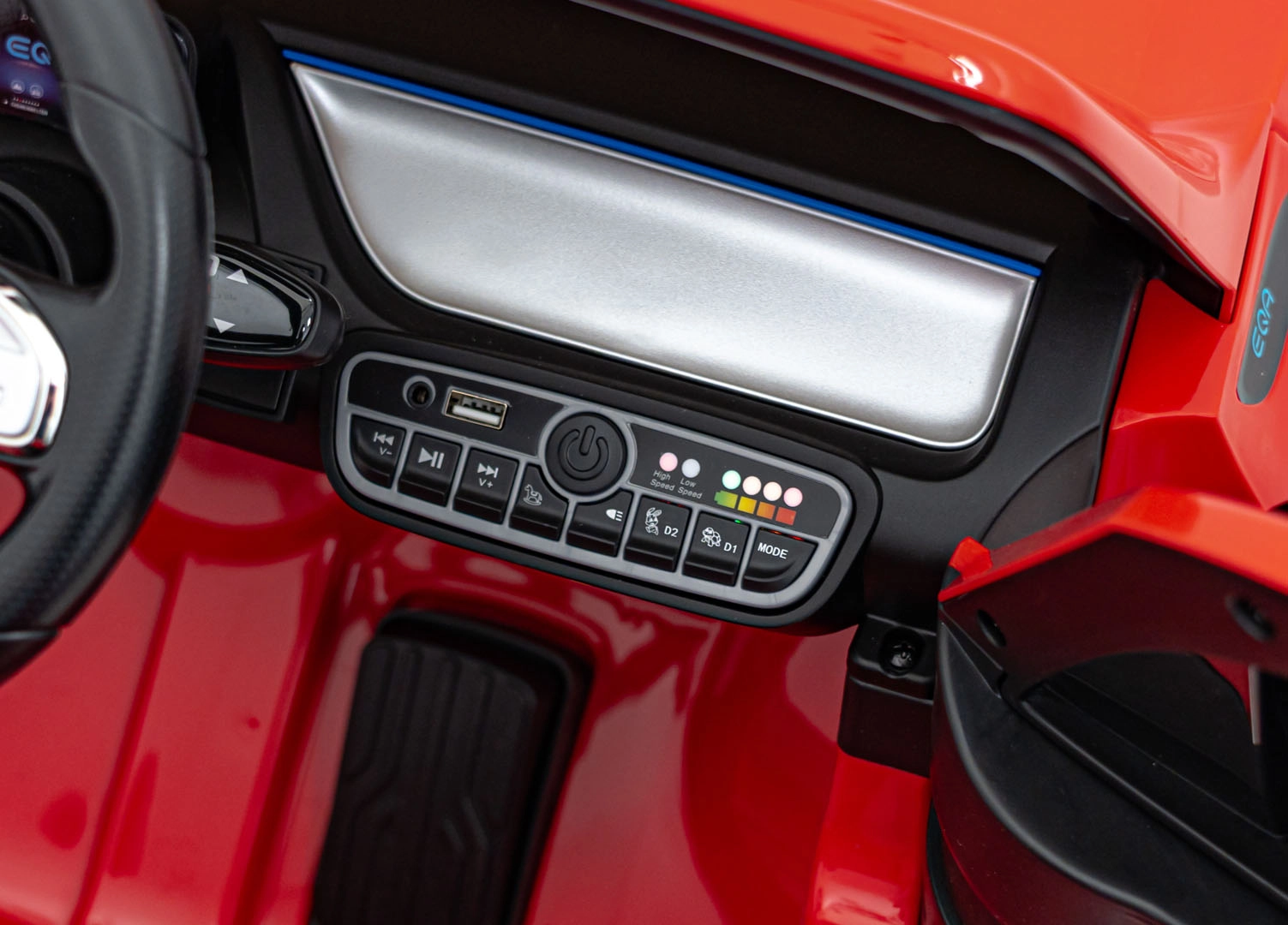 Interaktywny panel z Bluetooth, USB, MP3/AUX, wbudowanymi melodiami i klaksonem na kierownicy urozmaici każdą przejażdżkę ulubioną muzyką. Realistyczny wygląd dopełniają przednie i tylne światła LED, dopracowane wnętrze oraz otwierane drzwi dla łatwego wsiadania.