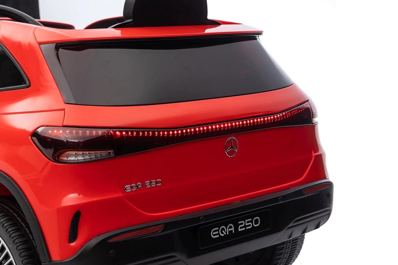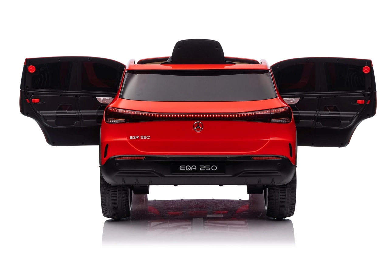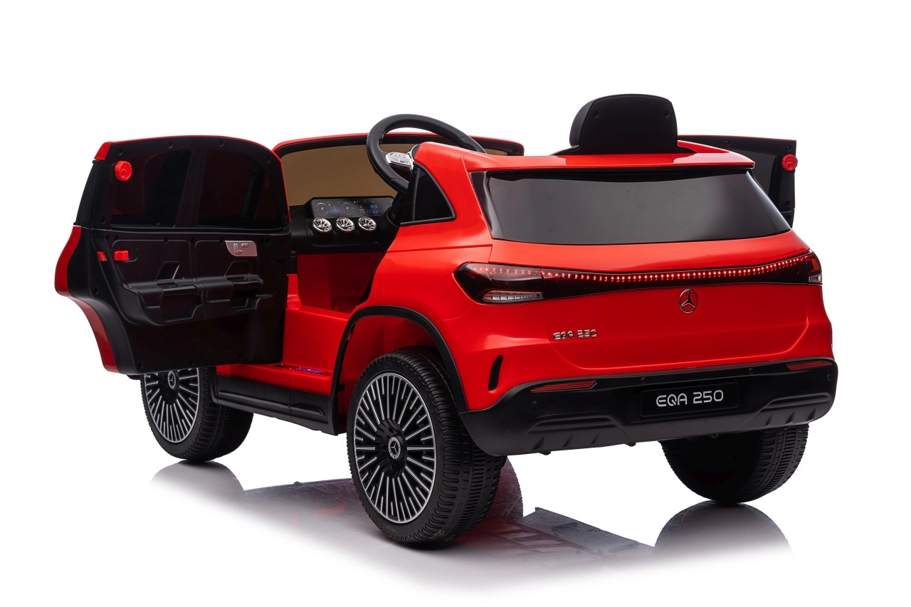 Stylowy dziecięcy samochód elektryczny Mercedes‑Benz EQA 250 w czerwonym kolorze oferuje silniki 4x35 W, wydajny akumulator 12 V 10 Ah oraz piankowe koła EVA dla komfortowej jazdy. Dzięki otwieranym drzwiom, światłom LED i rozbudowanemu panelowi audio z Bluetooth/USB/MP3 dzieci zyskują realistyczne wrażenia, a rodzice docenią zdalne sterowanie 2,4 GHz z awaryjnym przyciskiem Stop.