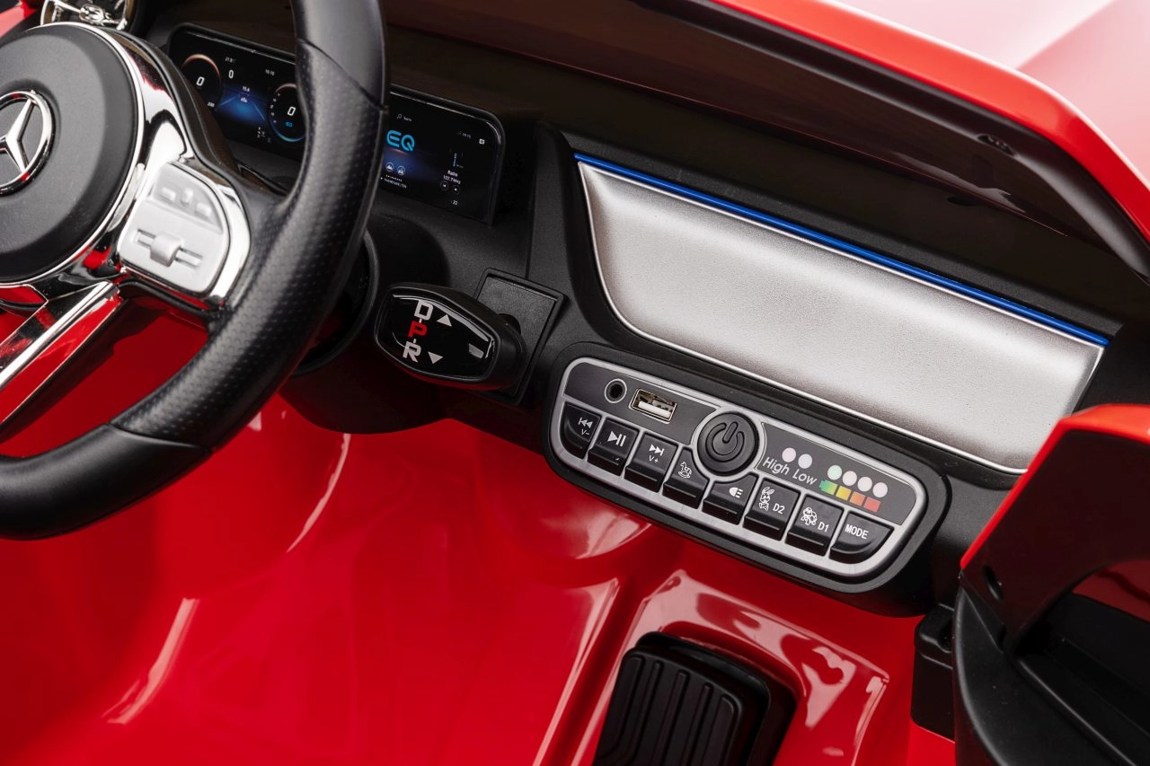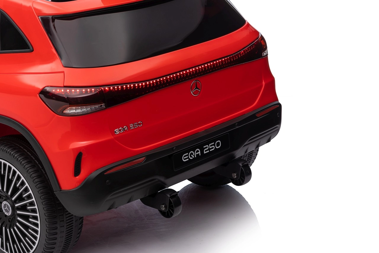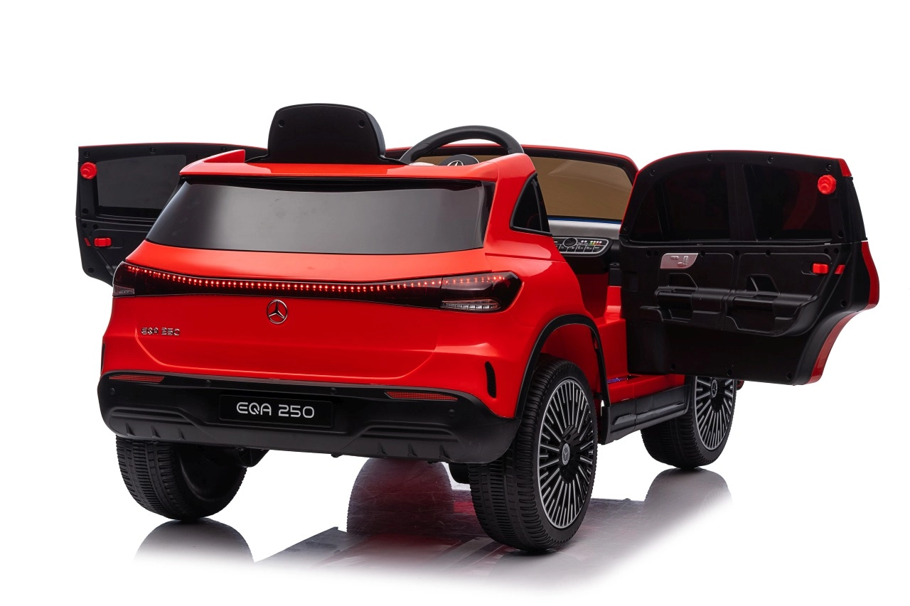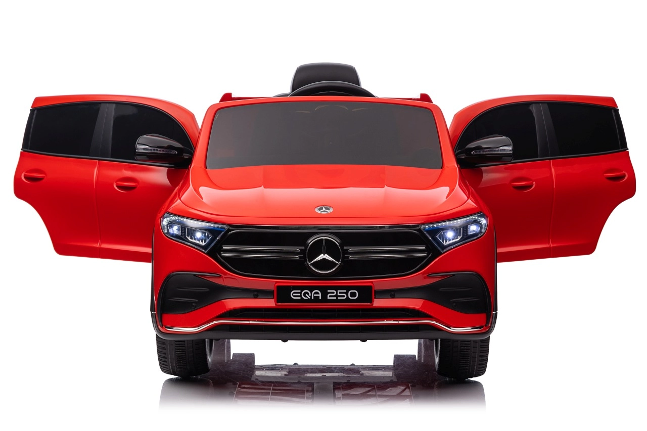 Stylowy dziecięcy samochód elektryczny Mercedes‑Benz EQA 250 w czerwonym kolorze oferuje silniki 4x35 W, wydajny akumulator 12 V 10 Ah oraz piankowe koła EVA dla komfortowej jazdy. Dzięki otwieranym drzwiom, światłom LED i rozbudowanemu panelowi audio z Bluetooth/USB/MP3 dzieci zyskują realistyczne wrażenia, a rodzice docenią zdalne sterowanie 2,4 GHz z awaryjnym przyciskiem Stop.