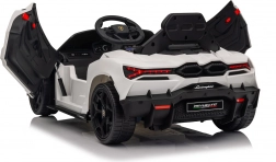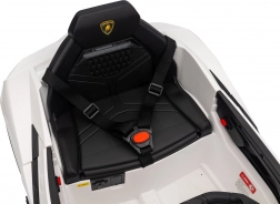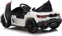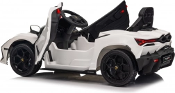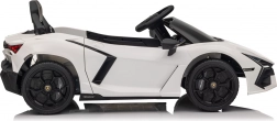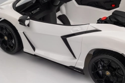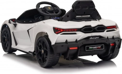 Stylowy dziecięcy elektryczny samochodzik LAMBORGHINI Revuelto w białym kolorze zapewnia realistyczne wrażenia z jazdy. Oferuje 4×35 W silniki, wydajny akumulator 12 V 9 Ah, miękkie koła EVA, otwierane drzwi, siedzisko z ekoskóry z pasami bezpieczeństwa oraz rozbudowany panel audio z Bluetooth/MP3/USB/FM. Rodzice docenią pilot 2,4 GHz z przyciskiem awaryjnego zatrzymania oraz płynny soft start dla bezpiecznej jazdy do przodu i do tyłu.