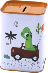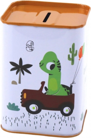 Wesołe ilustracje dinozaura w samochodzie i kolorowe wykonanie sprawiają, że skarbonka jest także piękną dekoracją.