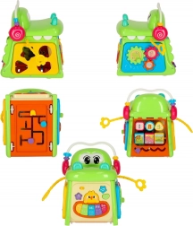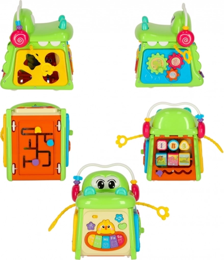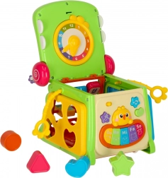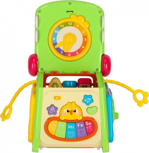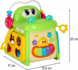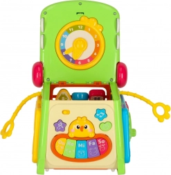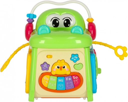 Ta sprytna i bezpieczna zabawka wspiera rozwój dziecka w naturalny sposób. Podczas zabawy maluchy ćwiczą małą motorykę, myślenie logiczne i koordynację oko–ręka, gdy wkładają kształty, naciskają przyciski, obracają elementy i obserwują świetlne oraz dźwiękowe efekty pianinka. Konstrukcja z zaokrąglonymi krawędziami i praktycznym uchwytem jest dopasowana do małych rączek.