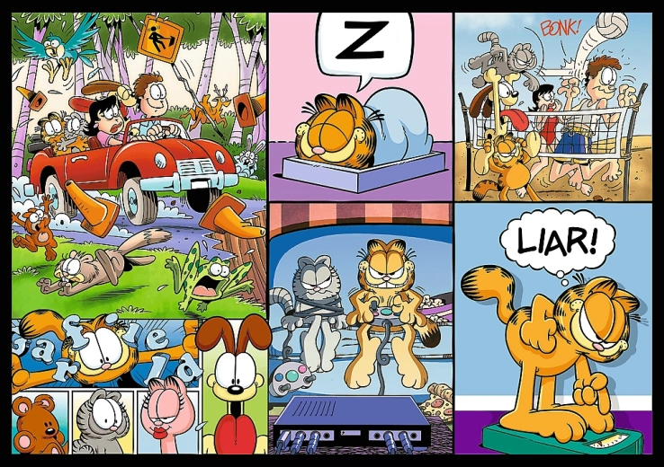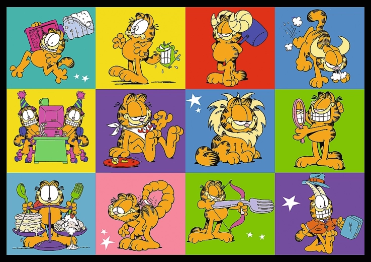 Odkryj cztery kolorowe ilustracje z legendarnym kotem GARFIELD, którego humor ucieszy małych i dużych. Każde puzzle po ułożeniu mają wymiary około 33,9 × 23,9 cm, więc wygodnie mieszczą się na stole lub podkładce. Dzięki 250 elementom na obrazek są idealne dla średnio zaawansowanych miłośników puzzli oraz na rodzinne popołudnia.