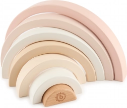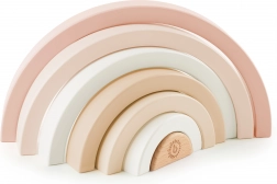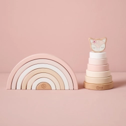 Ta minimalistyczna drewniana tęcza stanie się ulubioną zabawką i designerskim dodatkiem do dziecięcego pokoju. Dzieci mogą układać łuki, sortować je, budować mosty i tunele lub używać ich jako domków i zagródek dla figurek. Proste kształty pobudzają wyobraźnię i samodzielną zabawę.