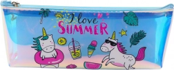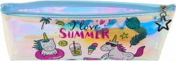 Piórnik zawiera holograficzne motywy jednorożców i letnich akcesoriów z napisem „I love SUMMER”.