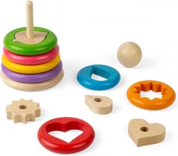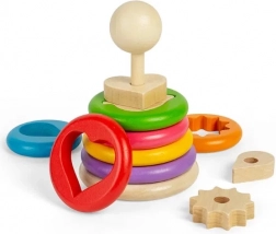 Ta oryginalna zabawka do układania oferuje siedem drewnianych krążków, z których każdy skrywa inny kształt – na przykład serce, gwiazdę, liść czy koło zębate. Dzieci najpierw dopasowują właściwy kształt do krążka, a następnie nawlekają cały element na drewniany patyczek. Zabawny sposób, by zrozumieć kształty, rozmiary i percepcję przestrzenną.