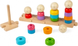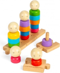 Ten drewniany zestaw do nakładania daje dzieciom radość odkrywania poprzez zabawę. Pięć oddzielnych słupków na podstawie–układance pozwala budować różnorodne postacie z kolorowych krążków i główek z buźkami. Dzięki wymiennym elementom dzieci mogą poznawać kształty, kolory i kolejność, a przy tym ćwiczyć cierpliwość oraz logiczne myślenie.