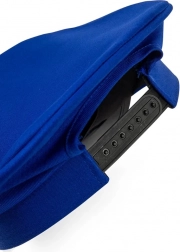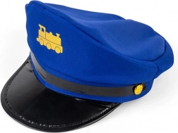 Niebieska czapka z połyskującym czarnym daszkiem i żółtym emblematem pociągu natychmiast tworzy atmosferę prawdziwej kolei.