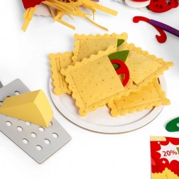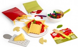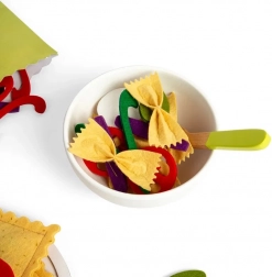 Z tym wszechstronnym zestawem dzieci pobawią się w małego szefa kuchni i przygotują własny talerz makaronu. Kolorowe, miękkie składniki z filcu, takie jak tagliatelle, ravioli czy farfalle, uzupełniają sos pomidorowy, pieczarki, listki bazylii oraz drewniana miska, talerz, dwie widelce i tarka z kawałkiem parmezanu – wszystko do realistycznej zabawy w kuchnię.