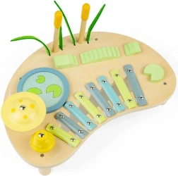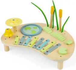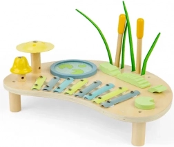 W zestawie znajdują się wbudowane instrumenty: ksylofon z metalowymi płytkami, bębenek w kształcie jeziorka, para dzwonków oraz elementy rytmiczne przypominające krokodyla. Dwie drewniane pałeczki ułatwiają grę i zachęcają dzieci do eksperymentowania z rytmem i tempem. Wyrób odpowiedzialnie wykonany z drewna FSC i wykończony nietoksycznymi farbami.