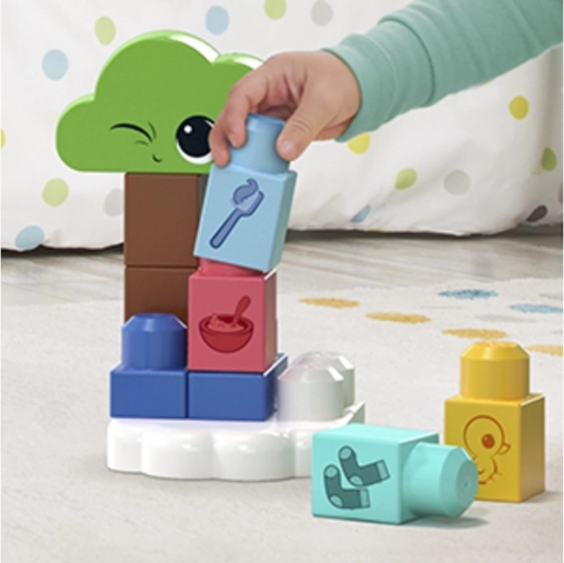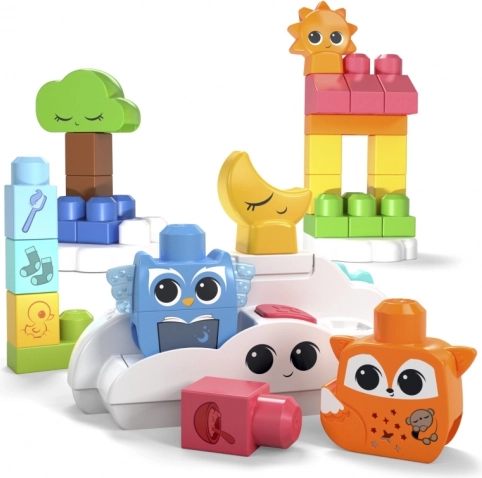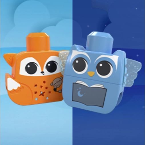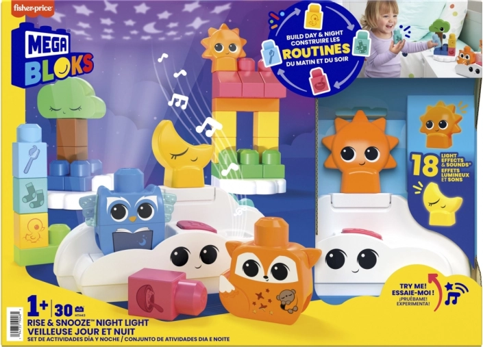 Interaktywny zestaw Mega Bloks z nocną lampką pomaga dzieciom budować zdrowe poranne i wieczorne rytuały. Zawiera 4 postacie i konstruowalne otoczenie. Na nocną lampkę można umieścić klocek z księżycem lub słońcem i uruchomić kołysanki, delikatne dźwięki, efekty świetlne oraz projektor gwiazd na wieczór, albo optymistyczne piosenki, dźwięki otoczenia i słoneczne wzory świetlne na rano. Idealne dla dzieci od 1 roku.