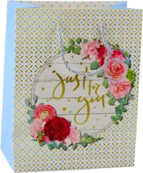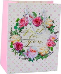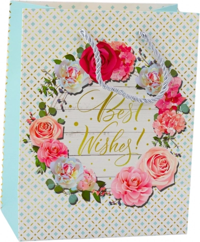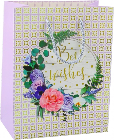 Torba prezentowa z romantycznym, kwiatowym wzorem i złotym napisem "Best Wishes" na wyjątkowe okazje.