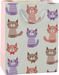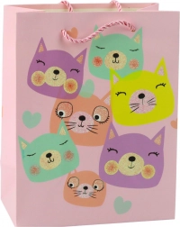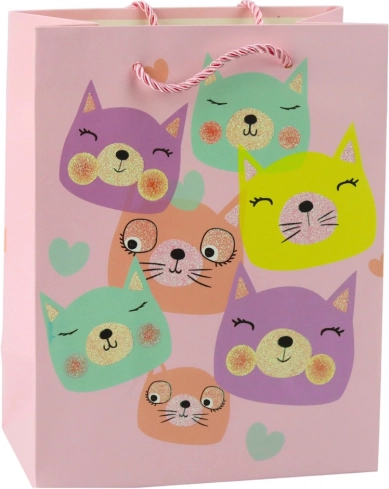 Torebka prezentowa z motywami uroczych kotków w pastelowych kolorach i brokatowymi akcentami.