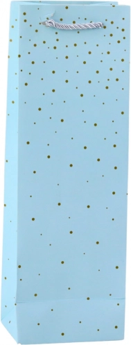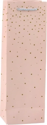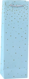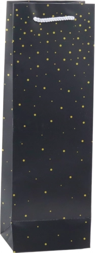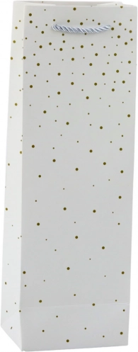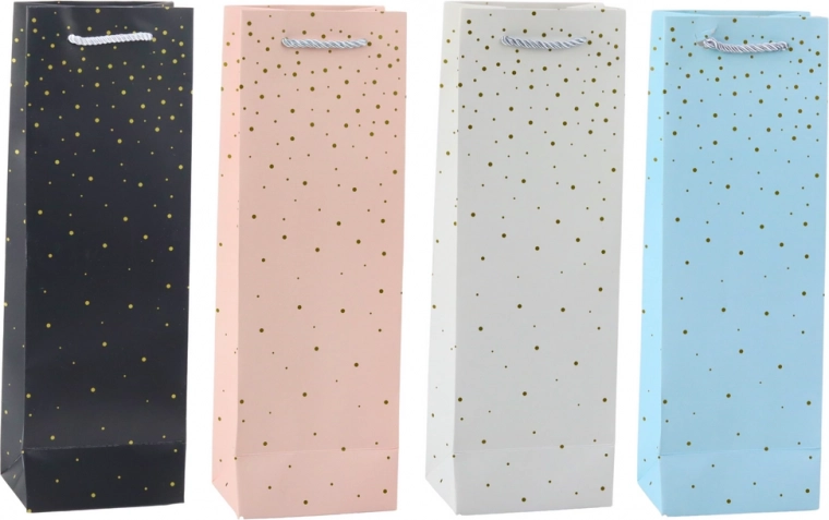 Elegancka papierowa torebka prezentowa na butelkę to doskonały sposób na zapakowanie napojów na różne okazje. Wykonana z wysokiej jakości papieru i wyróżniająca się subtelnym wzorem złotych kropek, które dodają elegancji i stylu.