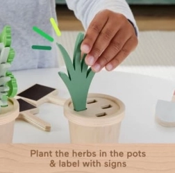 Dzieci mogą uprawiać zioła w doniczkach, opisywać je za pomocą dołączonych tabliczek (kreda nie jest częścią zestawu) oraz używać spryskiwacza, aby dbać o swój ogródek.