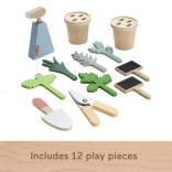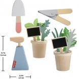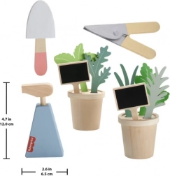 Drewniany ogrodniczy zestaw dla dzieci zawiera 12 elementów, w tym: 2 doniczki z drewnianymi liśćmi i roślinami, łyżkę do zabawy, nożyczki do zabawy, buteleczkę ze spryskiwaczem oraz 2 tabliczki do opisywania roślin. Produkt wykonany jest z drewna certyfikowanego Forest Stewardship Council (FSC-N004566) i ozdobiony nietoksycznymi farbami na bazie wody.