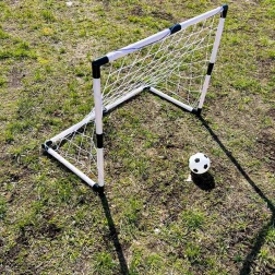 Dwie bramki, dwie piłki i ręczna pompka – wszystko przygotowane do natychmiastowej gry bez dodatkowych zakupów.