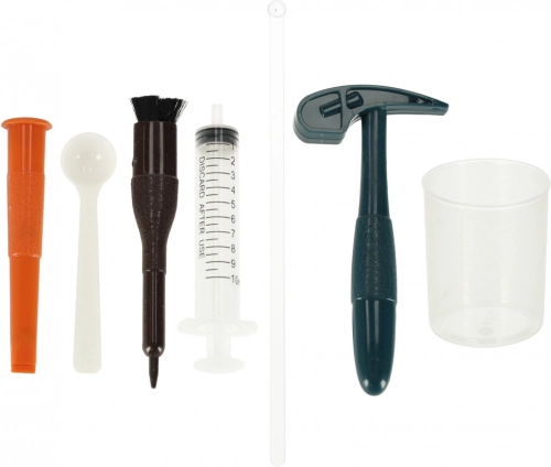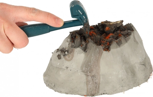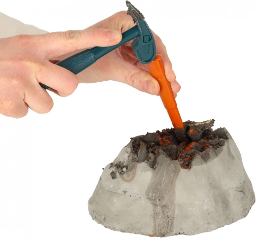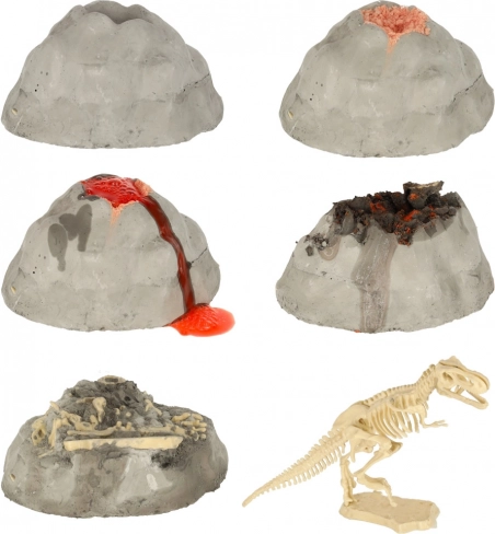 - model wulkanu z ukrytym dinozaurem i minerałami, kwas cytrynowy, wodorowęglan sodu, młotek, dłuta (wąskie i szerokie), pędzelek, strzykawka, łyżeczka, mieszadełko, kubeczek, plakat, szczegółowa instrukcja
