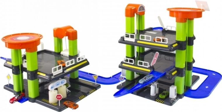 Ciesz się godzinami zabawy z tym wspaniałym, trzypoziomowym mega garażem, który obejmuje nowoczesne, dwu- i trzypoziomowe parkingi. Dzieci mogą za pomocą windy przenosić samochody na różne piętra i parkować je według uznania.